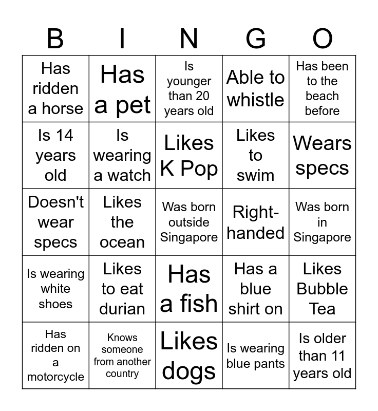 This bingo card has 25 words: Likes to eat durian, Likes dogs, Likes K Pop, Has ridden on a motorcycle, Has been to the beach before, Has ridden a horse, Is 14 years old, Has a pet, Right-handed, Has a fish, Likes to swim, Doesn't wear specs, Has a blue shirt on, Likes Bubble Tea, Is wearing a watch, Is older than 11 years old, Was born in Singapore, Is younger than 20 years old, Wears specs, Likes the ocean, Was born outside Singapore, Knows someone from another country, Is wearing white shoes, Able to whistle and Is wearing blue pants.
