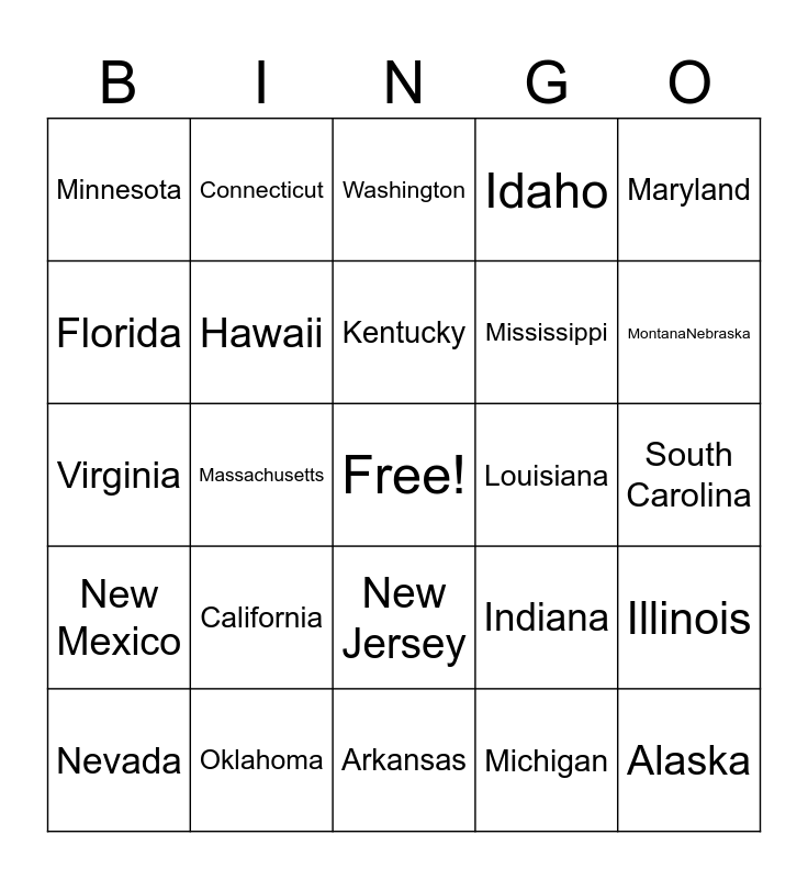 This bingo card has a free space and 49 words: Alabama, Alaska, Arizona, Arkansas, California, Colorado, Connecticut, Delaware, Florida, Georgia, Hawaii, Idaho, Illinois, Indiana, Iowa, Kansas, Kentucky, Louisiana, Maine, Maryland, Massachusetts, Michigan, Minnesota, Mississippi, Missouri, MontanaNebraska, Nevada, New Hampshire, New Jersey, New Mexico, New York, North Carolina, North Dakota, Ohio, Oklahoma, Oregon, Pennsylvania, Rhode Island, South Carolina, South Dakota, Tennessee, Texas, Utah, Vermont, Virginia, Washington, West Virginia, Wisconsin and Wyoming.