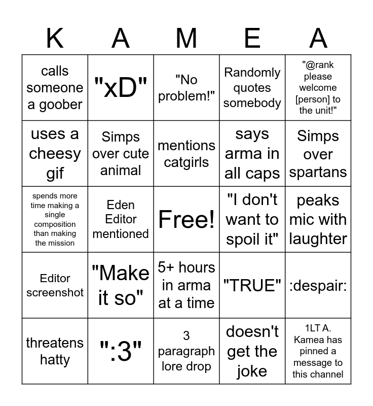 This bingo card has a free space and 24 words: "Make it so", ":3", mentions catgirls, threatens hatty, "@rank please welcome [person] to the unit!", calls someone a goober, uses a cheesy gif, "xD", "I don't want to spoil it", 5+ hours in arma at a time, says arma in all caps, spends more time making a single composition than making the mission, "TRUE", :despair:, Simps over cute animal, doesn't get the joke, peaks mic with laughter, "No problem!", Simps over spartans, Eden Editor mentioned, 1LT A. Kamea has pinned a message to this channel, Editor screenshot, Randomly quotes somebody and 3 paragraph lore drop.