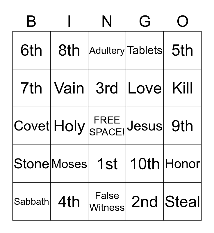 This bingo card has a free space and 26 words: 1st, 2nd, 3rd, 4th, 5th, 6th, 7th, 8th, 9th, 10th, Love, Covet, Honor, Sabbath, Holy, Sunday, Tablets, Stone, Adultery, Steal, Kill, False Witness, Jesus, Moses, Vain and Mt. Sinai.