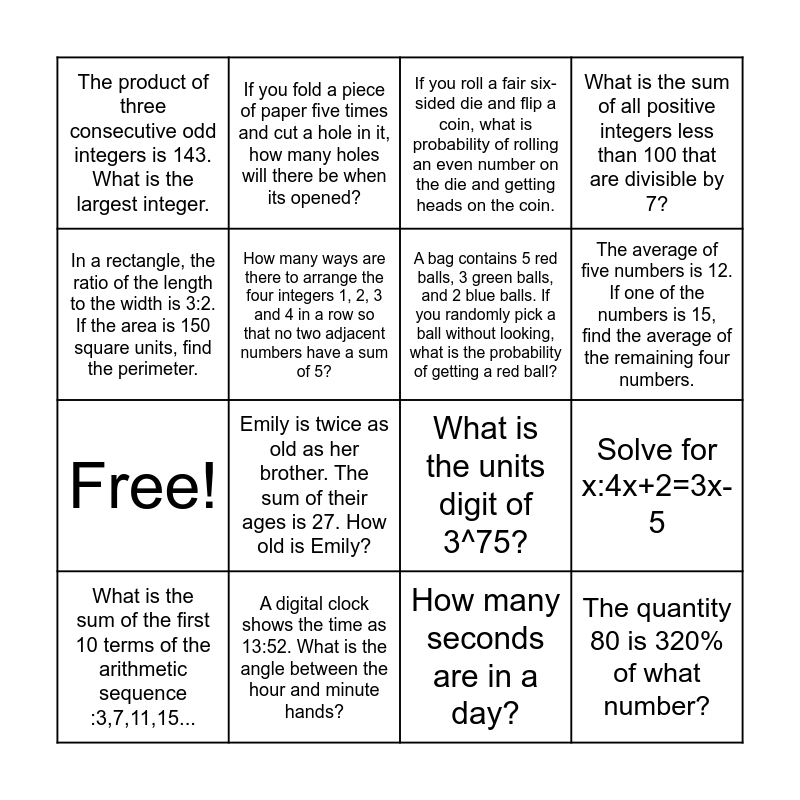 This bingo card has 20 words: Solve for x:4x+2=3x-5, What is the remainder when 2^10 is divided by 7?, If you roll a fair six-sided die and flip a coin, what is probability of rolling an even number on the die and getting heads on the coin., How many different ways can you arrange the letters in the word "INDIANA.", What is the sum of the first 10 terms of the arithmetic sequence :3,7,11,15..., In a rectangle, the ratio of the length to the width is 3:2. If the area is 150 square units, find the perimeter., A digital clock shows the time as 13:52. What is the angle between the hour and minute hands?, The product of three consecutive odd integers is 143. What is the largest integer., Free!, If you fold a piece of paper five times and cut a hole in it, how many holes will there be when its opened?, Emily is twice as old as her brother. The sum of their ages is 27. How old is Emily?, What is the units digit of 3^75?, How many ways are there to arrange the four integers 1, 2, 3 and 4 in a row so that no two adjacent numbers have a sum of 5?, The quantity 80 is 320% of what number?, A bag contains 5 red balls, 3 green balls, and 2 blue balls. If you randomly pick a ball without looking, what is the probability of getting a red ball?, The length of sides of hexagon H are 1,2,3,4,5,6. If no two consecutive sides have of H have consecutive integers, what is the sum of the 3 consecutive sides of H., The average of five numbers is 12. If one of the numbers is 15, find the average of the remaining four numbers., What is the sum of all positive integers less than 100 that are divisible by 7?, How many seconds are in a day? and In a group of 40 people, it is found that 25 own dogs and 22 own cats. Given that information, what is the minimum number of people who own both cats and dogs?.
