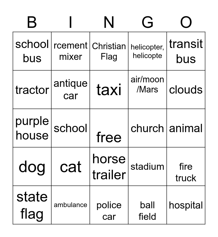 This bingo card has a free space and 28 words: convertible, ambulance, taxi, ball field, transit bus, school bus, antique car, police car, church, fire truck, purple house, school, stadium, hospital, tractor, library, horse trailer, helicopter, helicopte, clouds, state flag, rcement mixer, American flag, air/moon /Mars, animal, dog, cat, Christian Flag and stars.