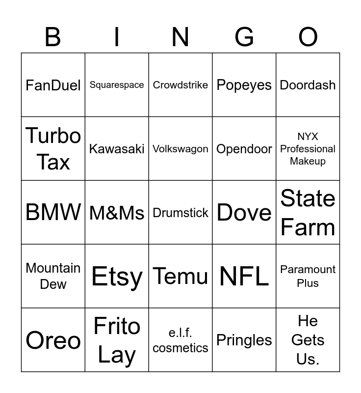 This bingo card has 25 words: Etsy, e.l.f. cosmetics, Volkswagon, Oreo, Doordash, FanDuel, Turbo Tax, Squarespace, Dove, Temu, Opendoor, BMW, NFL, Paramount Plus, Kawasaki, He Gets Us., State Farm, Crowdstrike, NYX Professional Makeup, M&Ms, Drumstick, Frito Lay, Mountain Dew, Popeyes and Pringles.