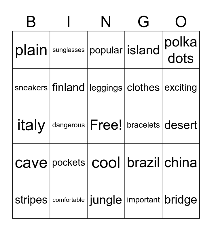 This bingo card has a free space and 24 words: pockets, comfortable, leggings, stripes, polka dots, plain, sneakers, sunglasses, bracelets, cool, clothes, italy, brazil, china, finland, important, desert, popular, exciting, dangerous, bridge, cave, island and jungle.