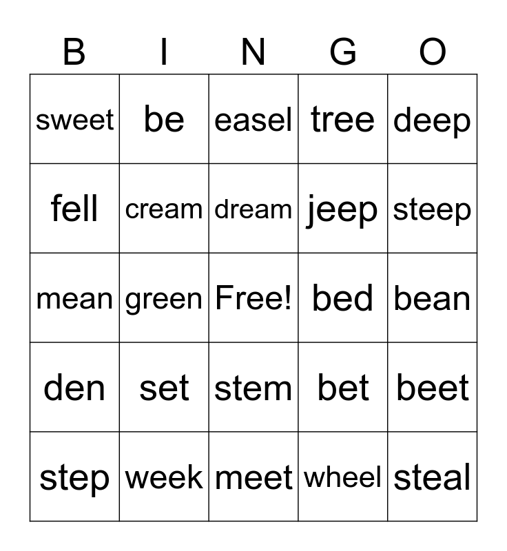This bingo card has a free space and 49 words: sheep, steal, met, meet, set, seat, be, flea, fell, spell, cream, tree, beet, bet, Pete, pet, dream, bed, bead, deep, green, wheel, sweet, jeep, me, steep, step, steam, stem, den, dean, speak, speck, eel, week, need, Ned, Ben, bean, sell, seal, pep, peep, men, mean, easel, peek, peck and eagle.