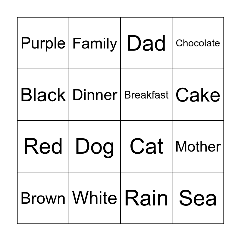 This bingo card has 20 words: Mother, Grandmother, Dad, Yellow, Brown, Black, White, Purple, Red, Family, Dog, Cat, Dinner, Sea, Breakfast, School, Cake, Chocolate, Rain and Sun.