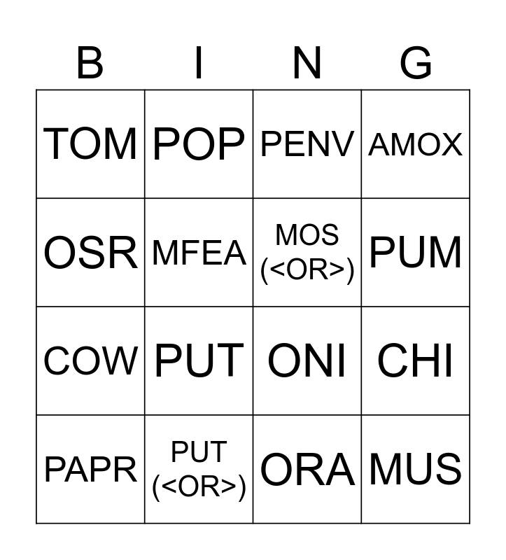 This bingo card has 16 words: PUT (<OR>), CHI, PENV, TOM, COW, POP, ONI, ORA, OSR, MFEA, PAPR, AMOX, PUT, PUM, MOS (<OR>) and MUS.