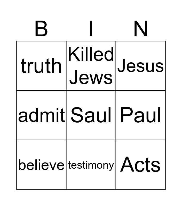 This bingo card has a free space and 12 words: truthfulness, new, Acts, Paul, Killed Jews, Jesus, testimony, crazy, truth, admit, believe and confess.