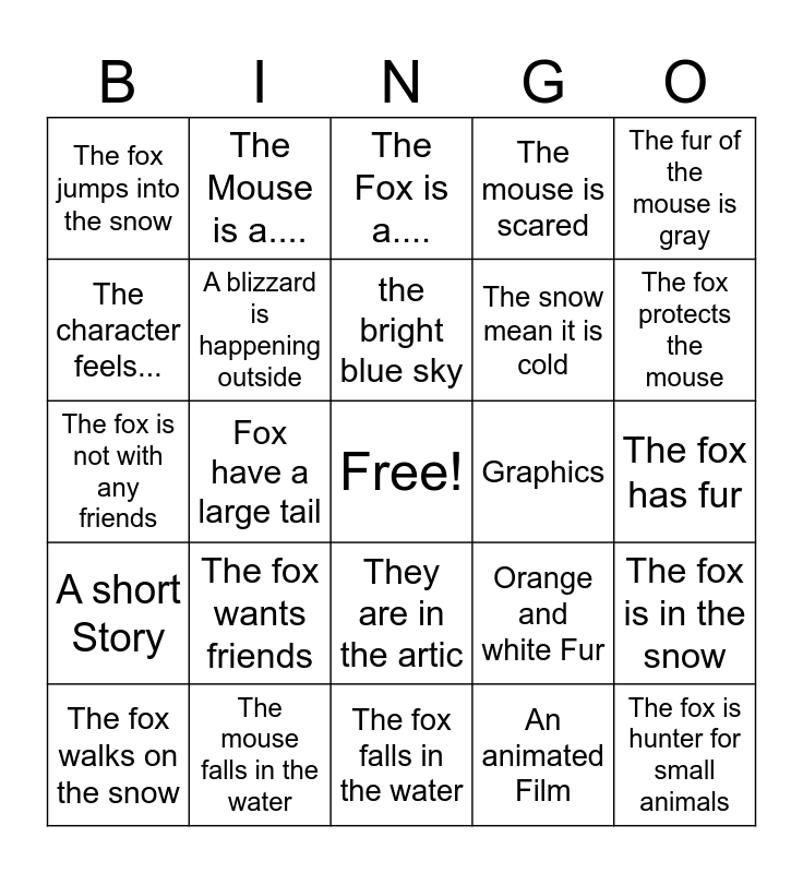 This bingo card has a free space and 28 words: The fox is in the snow, The mouse is very small, The snow mean it is cold, An animated Film, The character feels..., The Fox is a...., The Mouse is a...., A short Story, Graphics, The fox walks on the snow, The fox is not with any friends, The mouse is scared, The mouse falls in the water, The fox falls in the water, The fox protects the mouse, The mouse is relieved, The fox wants friends, A blizzard is happening outside, the bright blue sky, They are in the artic, The fox jumps into the snow, There is a frozen lake, The fox is hunter for small animals, Fox have a large tail, The fox has fur, Orange and white Fur, The fur of the mouse is gray and He is taking in the breeze.