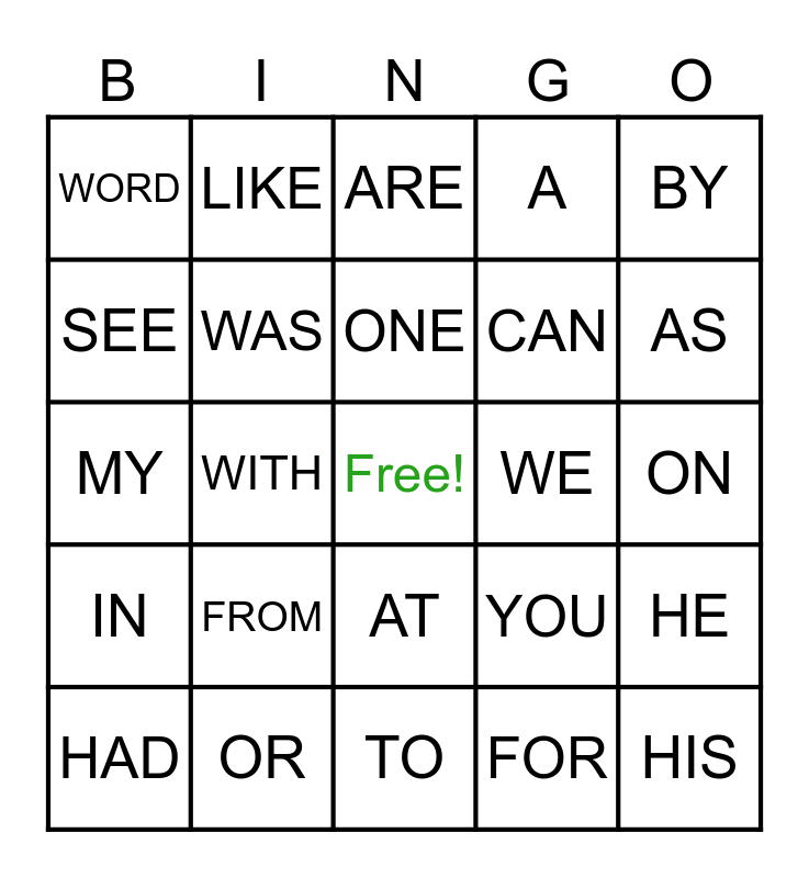 This bingo card has a free space and 24 words: FROM, OR, ONE, HAD, BY, WORD, SEE, LIKE, WE, AT, CAN, MY, YOU, HE, WAS, FOR, ON, ARE, AS, WITH, HIS, IN, A and TO.