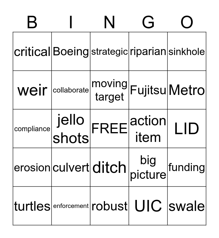 This bingo card has a free space and 31 words: robust, capacity, jello shots, routine, critical, strategic, collaborate, big picture, action item, UIC, LID, swale, vault, catchbasin, Metro, IGA, funding, culvert, erosion, ditch, sinkhole, Kane, turtles, Boeing, Fujitsu, weir, riparian, compliance, enforcement, moving target and calcs.