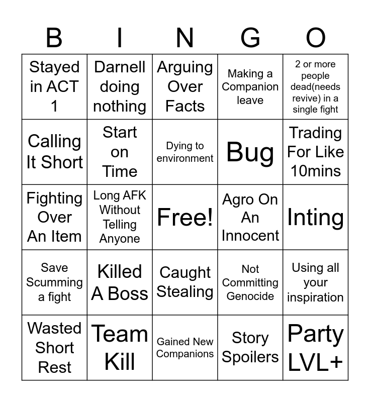 This bingo card has a free space and 29 words: Wasted Short Rest, Late Start, Long AFK Without Telling Anyone, Finished ACT 1, Stayed in ACT 1, Arguing Over Facts, Start on Time, Killed A Boss, Agro On An Innocent, Team Kill, Inting, Party LVL+, Gained New Companions, Story Spoilers, Trading For Like 10mins, Stealing A Party Member’s Items, Caught Stealing, Save Scumming a fight, 2 or more people dead(needs revive) in a single fight, Fighting Over An Item, Not Committing Genocide, Someone Going On Their Own Adventure, Bug, Calling It Short, Making a Companion leave, Darnell doing nothing, Using all your inspiration, Dying to environment and Darnell Using a cracked spell.