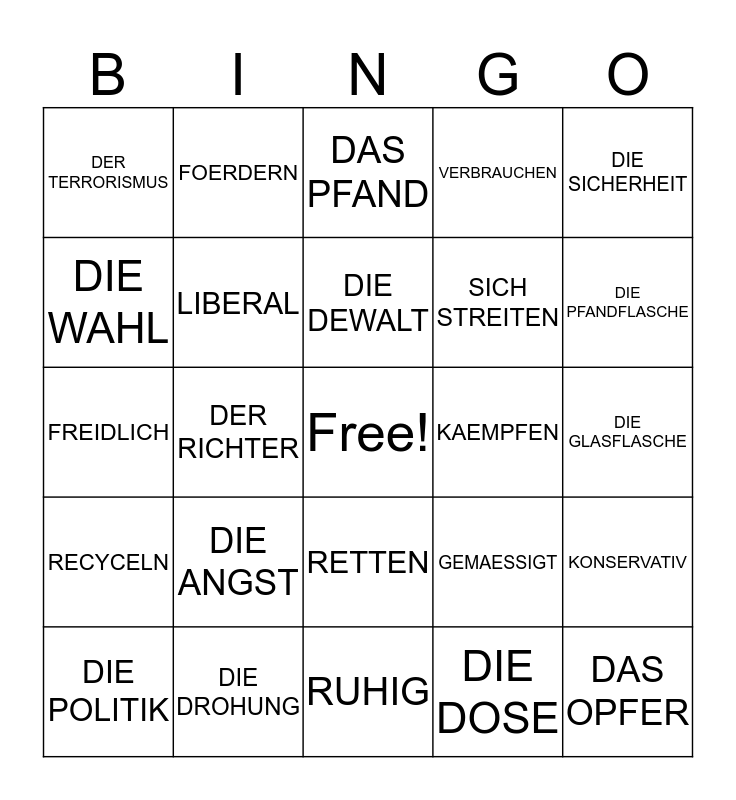 This bingo card has a free space and 24 words: DIE ANGST, DIE DROHUNG, DIE DEWALT, DIE POLITIK, DIE SICHERHEIT, DER TERRORISMUS, DIE WAHL, FOERDERN, KAEMPFEN, RETTEN, SICH STREITEN, FREIDLICH, GEMAESSIGT, KONSERVATIV, LIBERAL, DIE DOSE, DIE GLASFLASCHE, DAS PFAND, DIE PFANDFLASCHE, DER RICHTER, DAS OPFER, RECYCELN, VERBRAUCHEN and RUHIG.