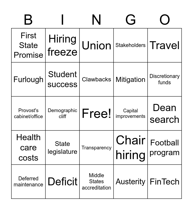 This bingo card has a free space and 28 words: Football program, Adjunct hiring, Mitigation, Austerity, Furlough, Union, Hiring freeze, Health care costs, Capital improvements, Deferred maintenance, Provost's cabinet/office, Stakeholders, Deficit, Middle States accreditation, Discretionary funds, Financial audit, State legislature, Student success, Clawbacks, Transparency, First State Promise, Shared governance, FinTech, Demographic cliff, Dean search, Chair hiring, Travel and Bailout.