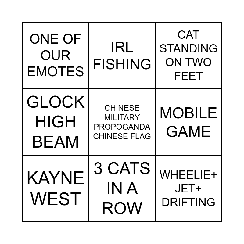 This bingo card has a free space and 8 words: MOBILE GAME, CAT STANDING ON TWO FEET, IRL FISHING, KAYNE WEST, ONE OF OUR EMOTES, WHEELIE+ JET+ DRIFTING, GLOCK HIGH BEAM and 3 CATS IN A ROW.