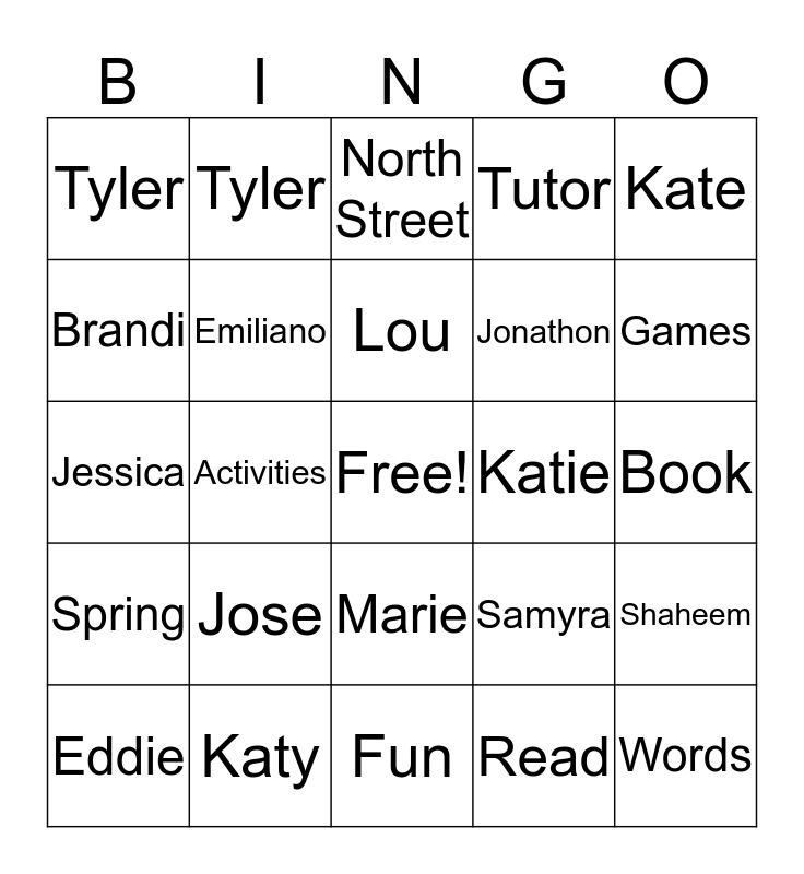 This bingo card has a free space and 24 words: Jose, Katy, Lou, Eddie, Kate, Tyler, Brandi, Tyler, Katie, Marie, Jonathon, Jessica, Samyra, Shaheem, Emiliano, Read, Book, North Street, Games, Activities, Words, Spring, Tutor and Fun.