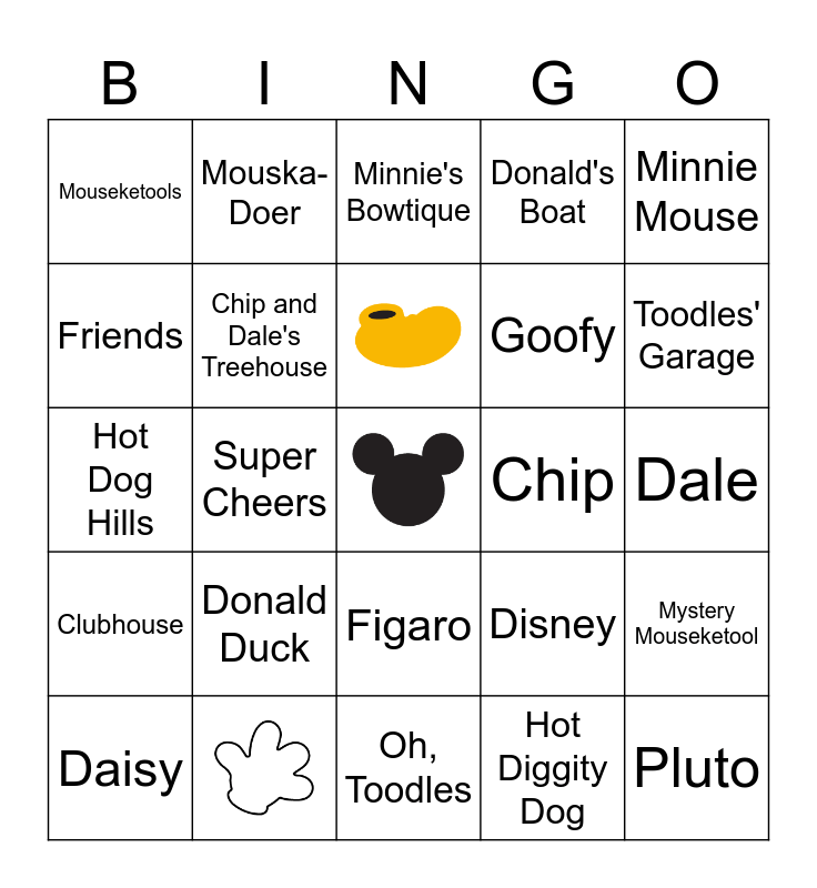 This bingo card has 3 images, a free space and 28 words: Mickey Mouse, Minnie Mouse, Mouseketools, Super Cheers, Oh, Toodles, Goofy, Pluto, Daisy, Donald Duck, Hot Diggity Dog, Clarabelle Cow, Clubhouse, Pete, Figaro, Chip, Dale, Professor Von Drake, Mouska-Doer, 2006, Disney, Toodles' Garage, Hot Dog Hills, Chip and Dale's Treehouse, Minnie's Bowtique, Donald's Boat, Mystery Mouseketool, Friends and Adventure.
