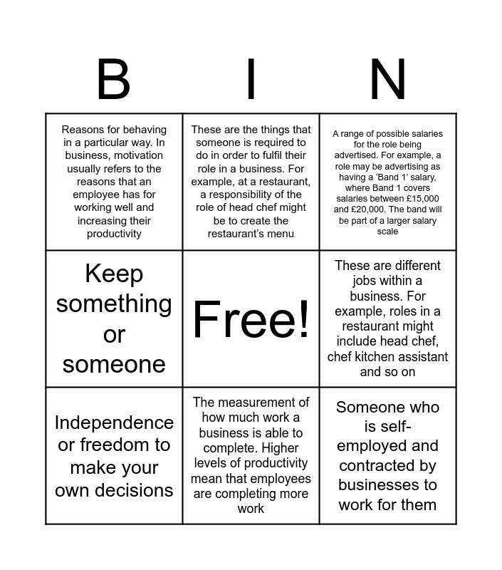 This bingo card has a free space and 12 words: Being responsible for something and being held responsible for it and its outcomes. For examples, a manager is often accountable for the actions of their staff, Technical or obscure words or terms used by a particular group of people that may not be understood by everyone, Someone who is self-employed and contracted by businesses to work for them, These are different jobs within a business. For example, roles in a restaurant might include head chef, chef kitchen assistant and so on, These are the things that someone is required to do in order to fulfil their role in a business. For example, at a restaurant, a responsibility of the role of head chef might be to create the restaurant’s menu, A range of possible salaries for the role being advertised. For example, a role may be advertising as having a ‘Band 1’ salary, where Band 1 covers salaries between £15,000 and £20,000. The band will be part of a larger salary scale, The measurement of how much work a business is able to complete. Higher levels of productivity mean that employees are completing more work, The laws that a business must comply with, Reasons for behaving in a particular way. In business, motivation usually refers to the reasons that an employee has for working well and increasing their productivity, Keep something or someone, Independence or freedom to make your own decisions and The sense of achievement or fulfilment that an employee gets from their job.