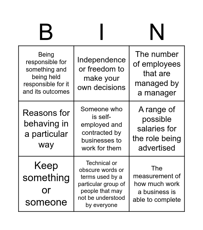 This bingo card has 15 words: Free!, In an organisational structure, the levels of job roles in the business, from the highest-paid directors to the most junior members of staff, The number of employees that are managed by a manager, Being responsible for something and being held responsible for it and its outcomes, Technical or obscure words or terms used by a particular group of people that may not be understood by everyone, Someone who is self-employed and contracted by businesses to work for them, Different jobs within a business, The things that someone is required to do in order to fulfil their role in a business, A range of possible salaries for the role being advertised, The measurement of how much work a business is able to complete, The laws that a business must comply with, Reasons for behaving in a particular way, Keep something or someone, Independence or freedom to make your own decisions and The sense of achievement or fulfilment that an employee gets from their job.