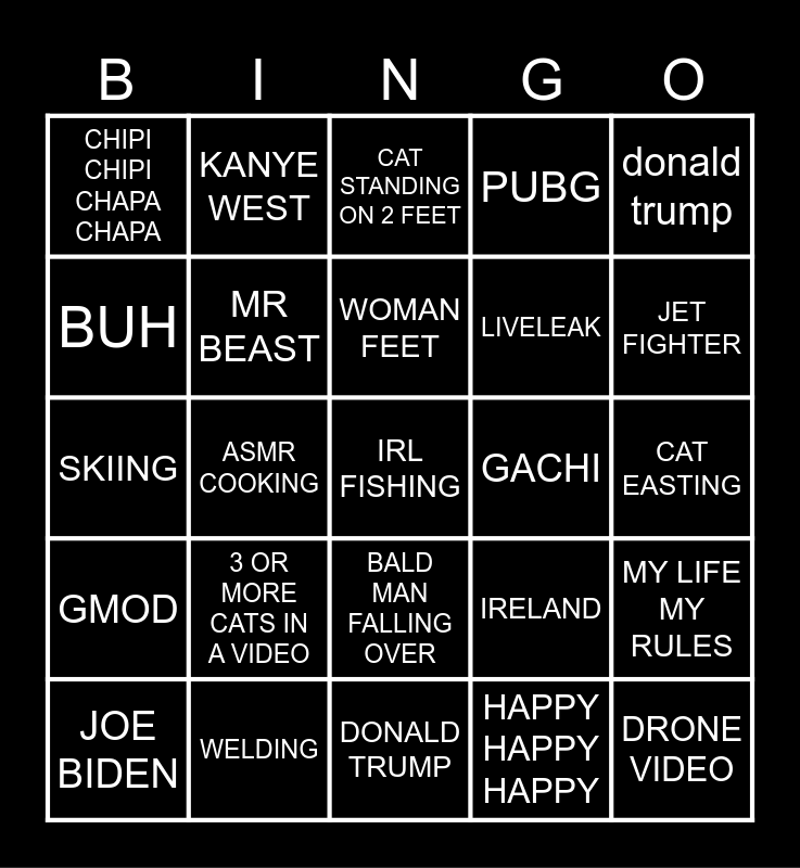 This bingo card has a free space and 24 words: 3 OR MORE CATS IN A VIDEO, WELDING, WOMAN FEET, JOE BIDEN, donald trump, CHIPI CHIPI CHAPA CHAPA, BUH, KANYE WEST, GACHI, BALD MAN FALLING OVER, LIVELEAK, SKIING, IRELAND, MY LIFE MY RULES, MR BEAST, HAPPY HAPPY HAPPY, CAT EASTING, CAT STANDING ON 2 FEET, JET FIGHTER, ASMR COOKING, DRONE VIDEO, GMOD, PUBG and DONALD TRUMP.