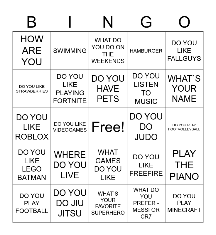 This bingo card has a free space and 29 words: DO YOU PLAY FOOTBALL, DO YOU LIKE STUDYING, DO YOU LIKE VIDEOGAMES, DO YOU LIKE SPORTS, HOW ARE YOU, WHAT DO YOU DO ON THE WEEKENDS, DO YOU LIKE PLAYING FORTNITE, WHERE DO YOU LIVE, DO YOU DO JUDO, DO YOU DO JIU JITSU, DO YOU PLAY FOOTVOLLEYBALL, DO YOU PLAY MINECRAFT, WHAT`S YOUR FAVORITE SUPERHERO, WHAT DO YOU PREFER -MESSI OR CR7, WHAT`S YOUR NAME, WHAT TEAM DO YOU CHEER FOR, WHAT GAMES DO YOU LIKE, DO YOU LIKE LEGO BATMAN, DO YOU LIKE FALLGUYS, DO YOU LIKE ROBLOX, DO YOU LIKE FREEFIRE, DO YOU LIKE BANANA, DO YOU LISTEN TO MUSIC, DO YOU LIKE STRAWBERRIES, HAMBURGER, SWIMMING, PLAY THE PIANO, DO YOU HAVE PETS and DO YOU HAVE SIBLINGS.