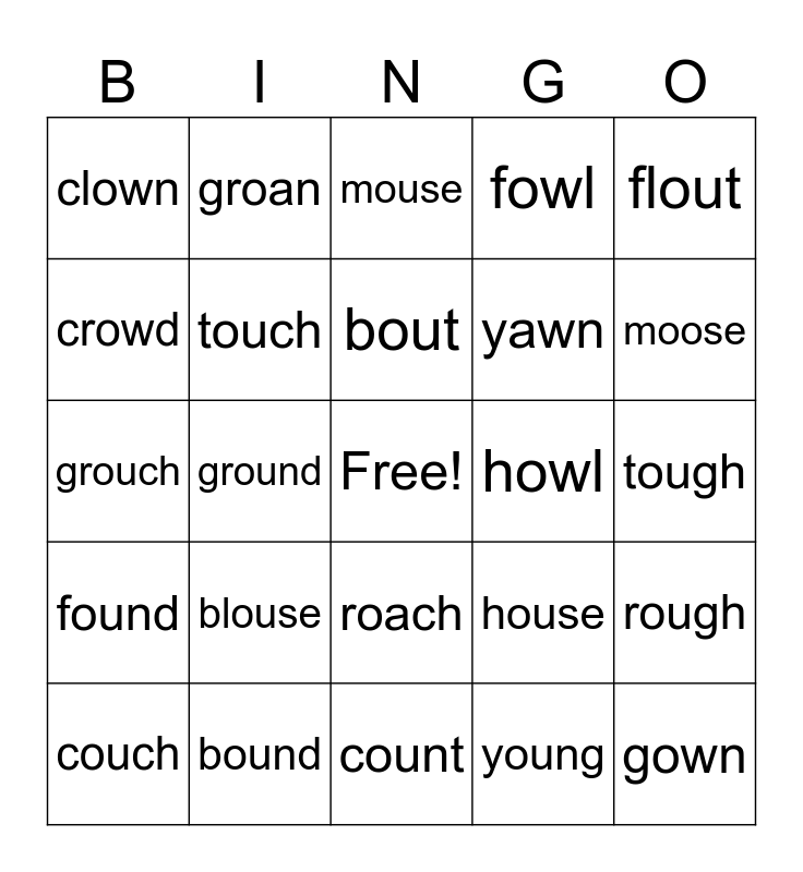 This bingo card has a free space and 24 words: blouse, bound, bout, couch, flout, clown, crowd, groan, howl, roach, yawn, grouch, house, rough, touch, young, tough, mouse, moose, ground, gown, found, fowl and count.