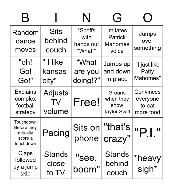 This bingo card has a free space and 24 words: Pacing, Stands close to TV, "What are you doing!?", Claps followed by a jump skip, Jumps over something, Random dance moves, "oh! Go! Go!", Sits behind couch, Groans when they show Taylor Swift, Sits on phone, Jumps up and down in place, Explains complex football strategy, "that's crazy", "P.I.", " I like kansas city", Stands behind couch, Convinces everyone to eat more food, *Scoffs with hands out "What!", "I just like Patty Mahomes", Adjusts TV volume, *heavy sigh*, "Touchdown" Before they actually score a touchdown, Imitates Patrick Mahomes voice and "see, boom".
