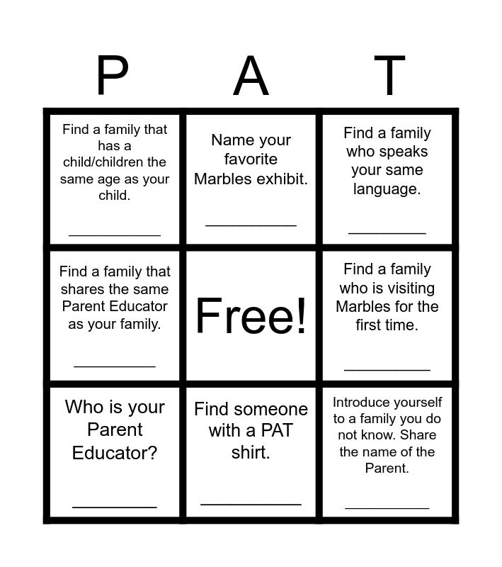 This bingo card has a free space and 8 words: Find a family who is visiting Marbles for the first time. __________, Find a family who speaks your same language. _________, Name your favorite Marbles exhibit. __________, Who is your Parent Educator? ________, Find a family that has a child/children the same age as your child. ____________, Introduce yourself to a family you do not know. Share the name of the Parent. ___________, Find a family that shares the same Parent Educator as your family. __________ and Find someone with a PAT shirt. __________.