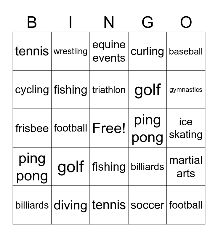 This bingo card has a free space and 50 words: baseball, football, soccer, tennis, golf, basketball, wrestling, gymnastics, cycling, equine events, fishing, curling, martial arts, billiards, frisbee, golf, triathlon, ping pong, motor racing, baseball, football, soccer, tennis, golf, basketball, wrestling, gymnastics, cycling, equine events, fishing, hockey, track and field, sailing, rowing, diving, weight lifting, swimming, skiing, bob sledding, ice skating, archery, boxing, curling, martial arts, billiards, frisbee, golf, triathlon, ping pong and motor racing.