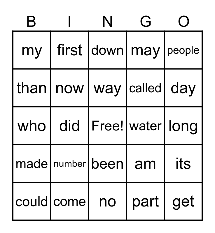 This bingo card has a free space and 25 words: number, no, way, could, people, my, than, first, water, been, called, who, am, its, now, find, long, down, day, did, get, come, made, may and part.