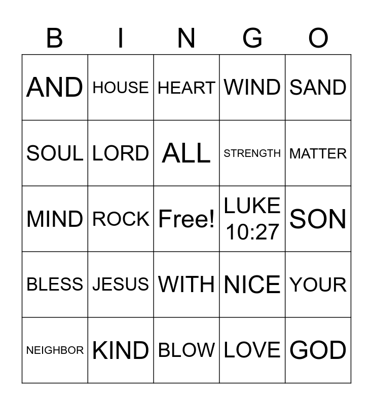 This bingo card has a free space and 24 words: JESUS, KIND, ALL, NEIGHBOR, SAND, AND, SOUL, HOUSE, LUKE 10:27, WITH, STRENGTH, MIND, NICE, YOUR, LORD, LOVE, SON, HEART, MATTER, ROCK, GOD, BLESS, WIND and BLOW.