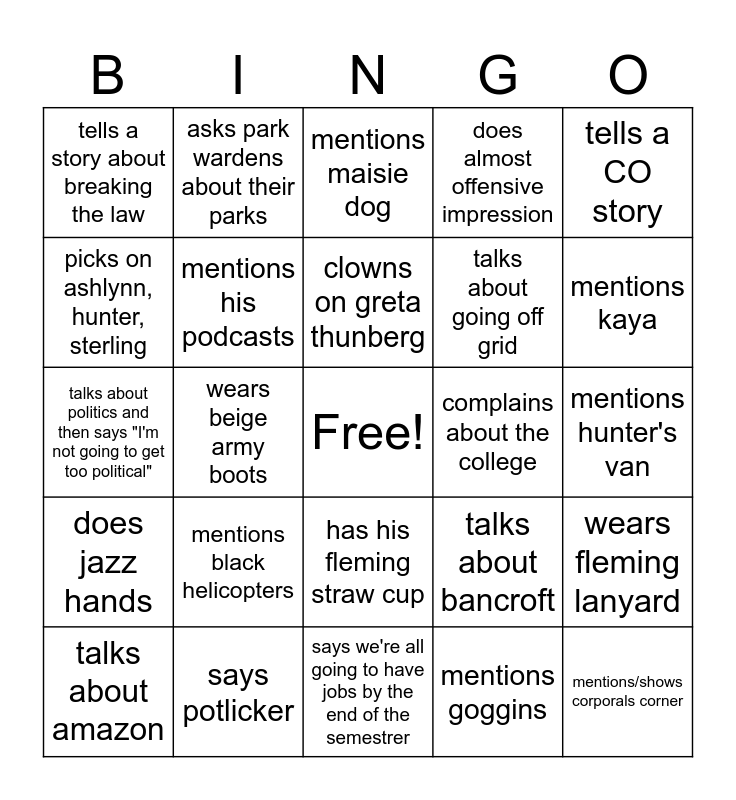 This bingo card has a free space and 24 words: mentions black helicopters, says potlicker, clowns on greta thunberg, talks about amazon, tells a CO story, tells a story about breaking the law, picks on ashlynn, hunter, sterling, asks park wardens about their parks, complains about the college, has his fleming straw cup, talks about going off grid, talks about politics and then says "I'm not going to get too political", talks about bancroft, wears fleming lanyard, mentions his podcasts, mentions goggins, mentions hunter's van, mentions maisie dog, mentions kaya, wears beige army boots, mentions/shows corporals corner, does jazz hands, does almost offensive impression and says we're all going to have jobs by the end of the semestrer.