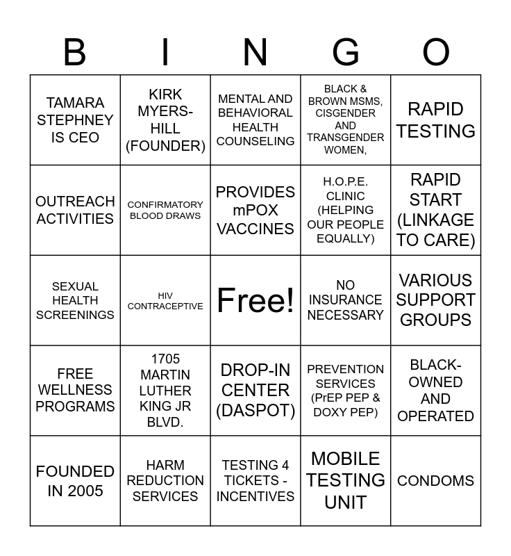 This bingo card has a free space and 24 words: 1705 MARTIN LUTHER KING JR BLVD., HARM REDUCTION SERVICES, PROVIDES mPOX VACCINES, FOUNDED IN 2005, RAPID TESTING, TAMARA STEPHNEY IS CEO, OUTREACH ACTIVITIES, KIRK MYERS-HILL (FOUNDER), NO INSURANCE NECESSARY, DROP-IN CENTER (DASPOT), H.O.P.E. CLINIC (HELPING OUR PEOPLE EQUALLY), SEXUAL HEALTH SCREENINGS, PREVENTION SERVICES (PrEP PEP & DOXY PEP), BLACK-OWNED AND OPERATED, CONFIRMATORY BLOOD DRAWS, MOBILE TESTING UNIT, VARIOUS SUPPORT GROUPS, MENTAL AND BEHAVIORAL HEALTH COUNSELING, RAPID START (LINKAGE TO CARE), HIV CONTRACEPTIVE, CONDOMS, FREE WELLNESS PROGRAMS, BLACK & BROWN MSMS, CISGENDER AND TRANSGENDER WOMEN, and TESTING 4 TICKETS - INCENTIVES.