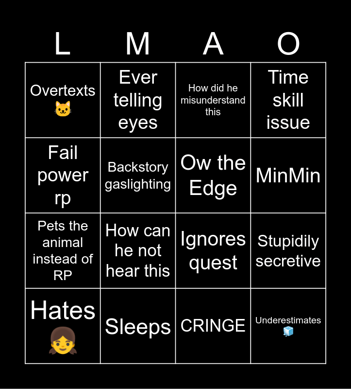 This bingo card has 17 words: CRINGE, Hates 👧, How did he misunderstand this, Overtexts🐱, How can he not hear this, Time skill issue, Stupidily secretive, Ow the Edge, MinMin, Backstory gaslighting, Sleeps, Ignores quest, Fail power rp, Ever telling eyes, Pets the animal instead of RP, "God" and Underestimates 🧊.