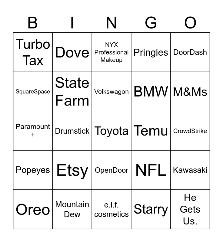 This bingo card has 25 words: Etsy, e.l.f. cosmetics, Volkswagon, Oreo, DoorDash, Turbo Tax, SquareSpace, Dove, Temu, OpenDoor, BMW, Paramount +, NFL, Kawasaki, State Farm, He Gets Us., CrowdStrike, NYX Professional Makeup, M&Ms, Drumstick, Toyota, Mountain Dew, Popeyes, Pringles and Starry.