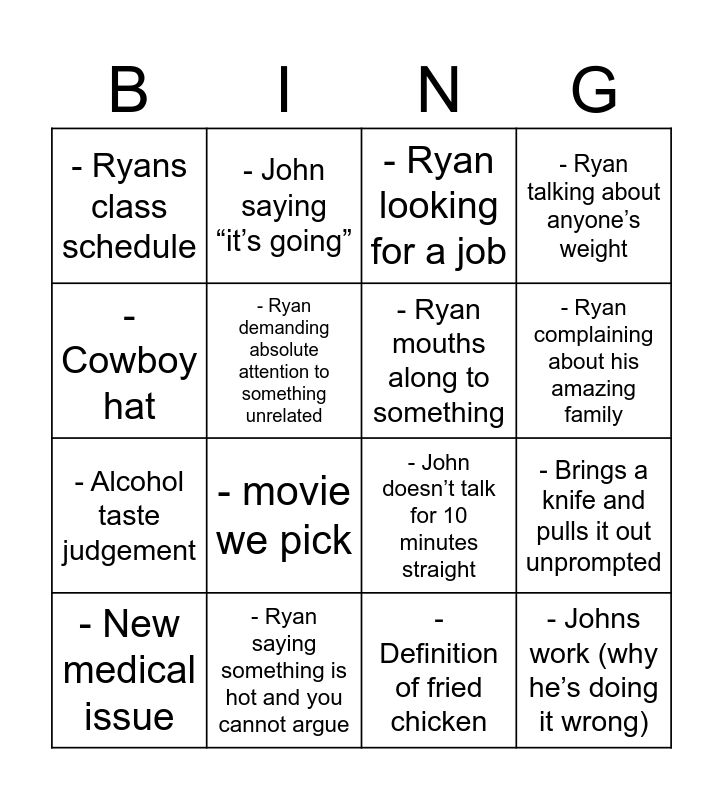 This bingo card has 18 words: - movie we pick, - Johns work (why he’s doing it wrong), - Ryan looking for a job, - Ryans class schedule, - John doesn’t talk for 10 minutes straight, - Ryan talking about anyone’s weight, - New medical issue, - John saying “it’s going”, - Ryan complaining about his amazing family, - Alcohol taste judgement, - Definition of fried chicken, - Cowboy hat, - Brings a knife and pulls it out unprompted, - Ryan demanding absolute attention to something unrelated, - Ryan mouths along to something, - Ryans eating habits, - Ryan saying something is hot and you cannot argue and - Saying something mean about ur partner.