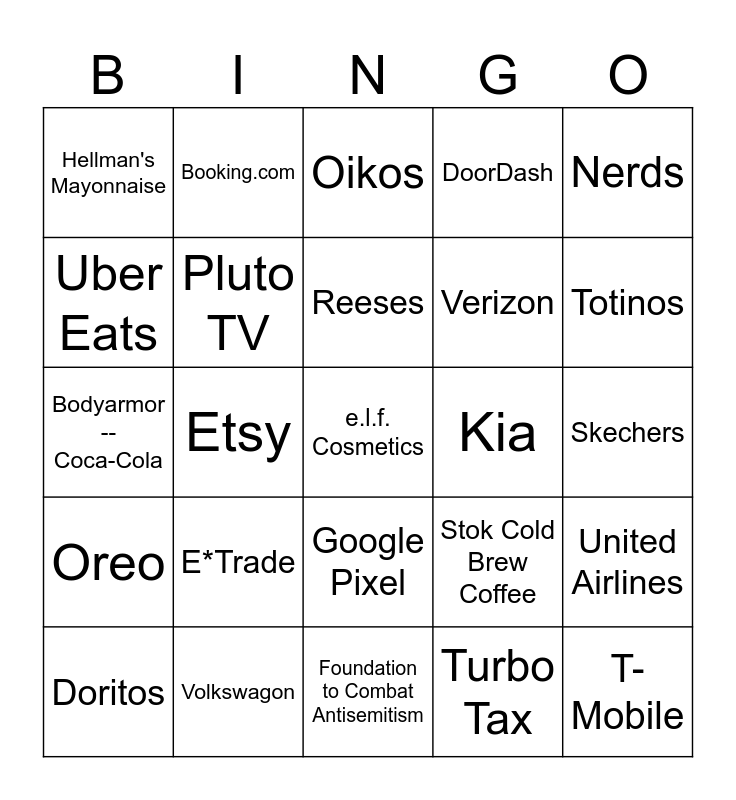 This bingo card has 25 words: E*Trade, Foundation to Combat Antisemitism, Reeses, Doritos, Nerds, Hellman's Mayonnaise, Uber Eats, Booking.com, Kia, Google Pixel, Verizon, Bodyarmor -- Coca-Cola, Stok Cold Brew Coffee, United Airlines, Pluto TV, T-Mobile, Skechers, Oikos, Totinos, Etsy, e.l.f. Cosmetics, Volkswagon, Oreo, DoorDash and Turbo Tax.