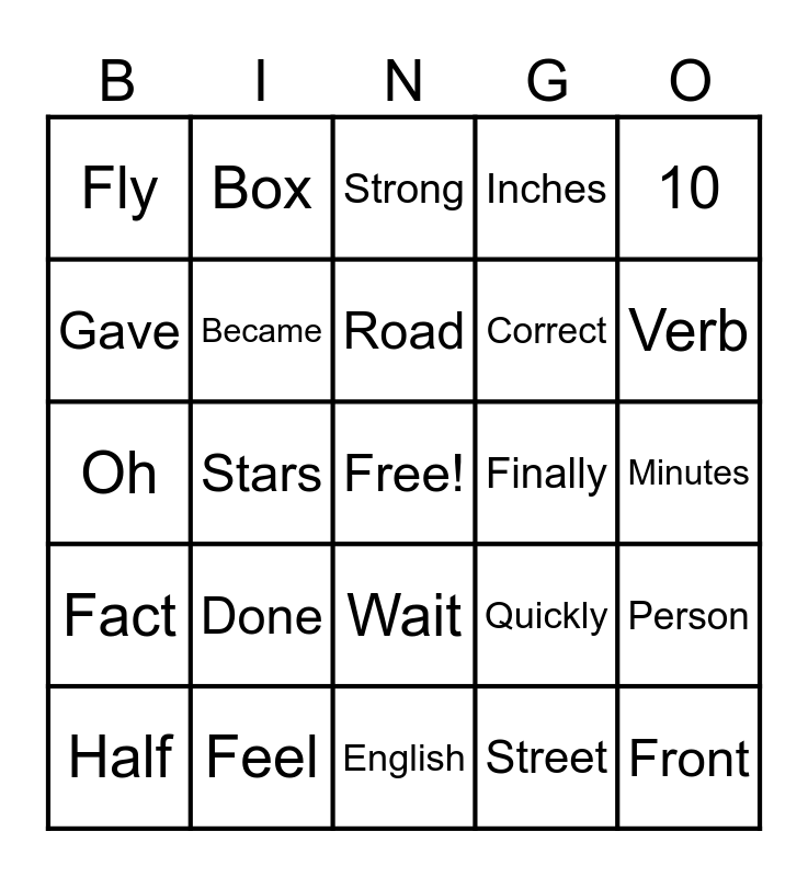 This bingo card has a free space and 25 words: Done, English, Road, Half, 10, Fly, Gave, Box, Finally, Wait, Correct, Oh, Quickly, Person, Became, Shown, Minutes, Strong, Verb, Stars, Front, Feel, Fact, Inches and Street.