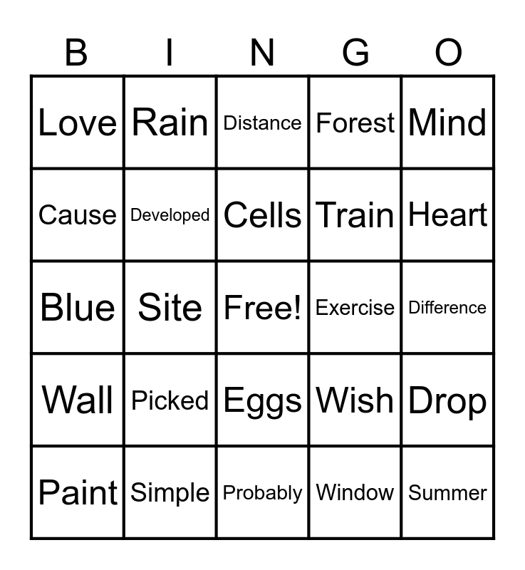 This bingo card has a free space and 24 words: Picked, Simple, Cells, Paint, Mind, Love, Cause, Rain, Exercise, Eggs, Train, Blue, Wish, Drop, Developed, Window, Difference, Distance, Heart, Site, Summer, Wall, Forest and Probably.