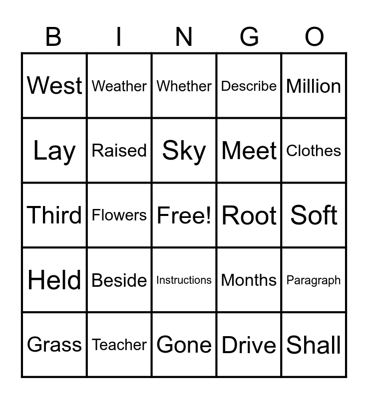 This bingo card has a free space and 25 words: Beside, Gone, Sky, Grass, Million, West, Lay, Weather, Root, Instructions, Meet, Third, Months, Paragraph, Raised, Represent, Soft, Whether, Clothes, Flowers, Shall, Teacher, Held, Describe and Drive.
