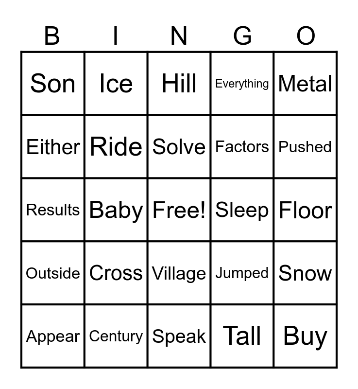 This bingo card has a free space and 25 words: Cross, Speak, Solve, Appear, Metal, Son, Either, Ice, Sleep, Village, Factors, Results, Jumped, Snow, Ride, Care, Floor, Hill, Pushed, Baby, Buy, Century, Outside, Everything and Tall.