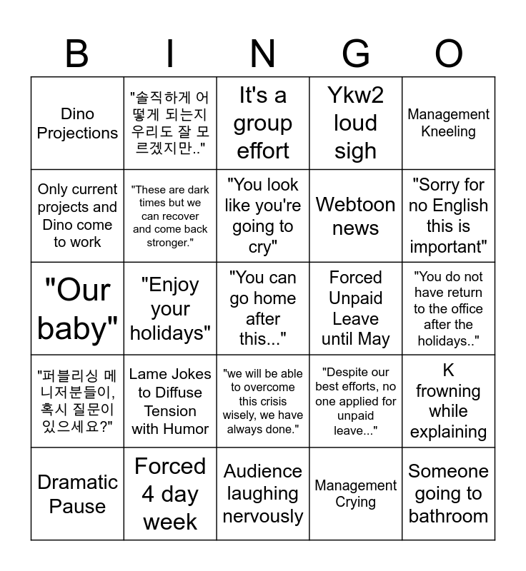This bingo card has a free space and 24 words: Dramatic Pause, Lame Jokes to Diffuse Tension with Humor, "You look like you're going to cry", Management Crying, Management Kneeling, Dino Projections, "솔직하게 어떻게 되는지 우리도 잘 모르겠지만..", It's a group effort, Forced Unpaid Leave until May, "You do not have return to the office after the holidays..", "Our baby", "These are dark times but we can recover and come back stronger.", "Despite our best efforts, no one applied for unpaid leave...", K frowning while explaining, Only current projects and Dino come to work, Forced 4 day week, Audience laughing nervously, Ykw2 loud sigh, "Sorry for no English this is important", "퍼블리싱 메니저분들이, 혹시 질문이 있으세요?", "Enjoy your holidays", "we will be able to overcome this crisis wisely, we have always done.", Webtoon news and Someone going to bathroom.