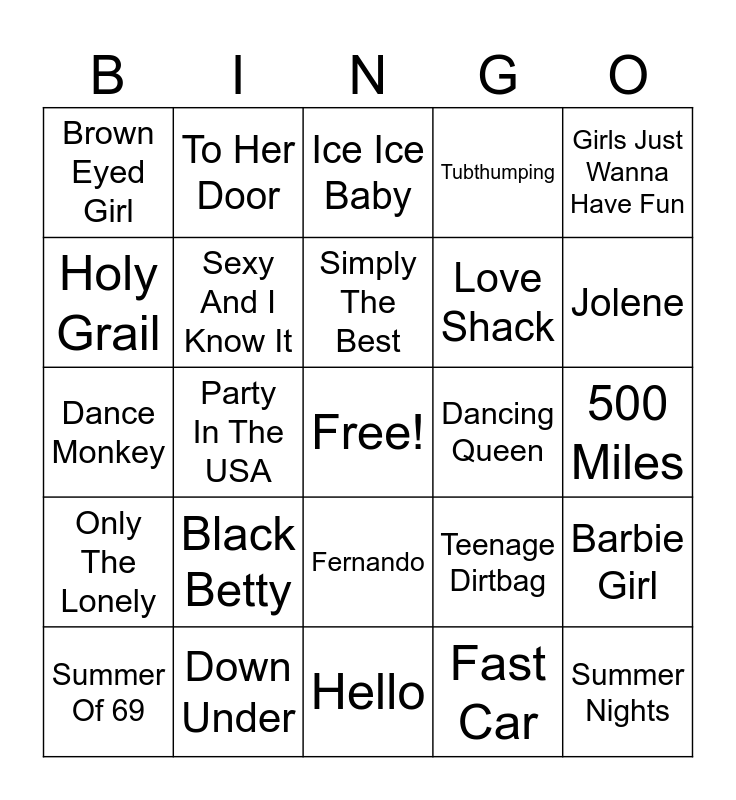 This bingo card has a free space and 24 words: Black Betty, Down Under, Simply The Best, Summer Of 69, Girls Just Wanna Have Fun, Brown Eyed Girl, Holy Grail, To Her Door, Dancing Queen, Fernando, Love Shack, Dance Monkey, Teenage Dirtbag, Barbie Girl, Sexy And I Know It, Fast Car, 500 Miles, Ice Ice Baby, Jolene, Party In The USA, Summer Nights, Only The Lonely, Tubthumping and Hello.