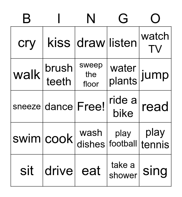 This bingo card has a free space and 24 words: cook, drive, sweep the floor, sit, watch TV, cry, walk, kiss, ride a bike, wash dishes, water plants, sneeze, play football, play tennis, brush teeth, take a shower, read, draw, jump, dance, sing, swim, listen and eat.