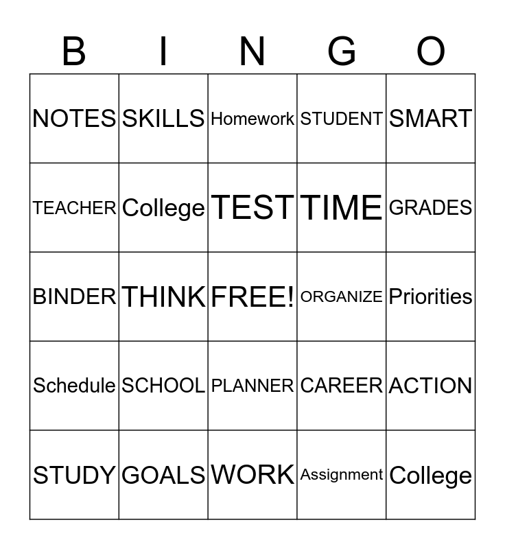 This bingo card has a free space and 24 words: SCHOOL, GOALS, TEST, STUDY, SMART, NOTES, TEACHER, SKILLS, ORGANIZE, PLANNER, TIME, BINDER, CAREER, ACTION, College, Assignment, Priorities, Homework, GRADES, THINK, College, Schedule, STUDENT and WORK.