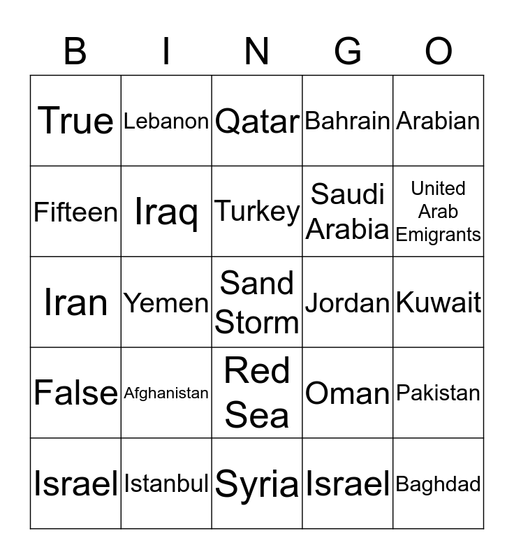This bingo card has a free space and 24 words: Afghanistan, Istanbul, Turkey, Israel, Arabian, True, Fifteen, Lebanon, Jordan, Red Sea, Saudi Arabia, Iran, Oman, Pakistan, Iraq, Israel, Kuwait, Qatar, United Arab Emigrants, Yemen, Baghdad, False, Bahrain and Syria.