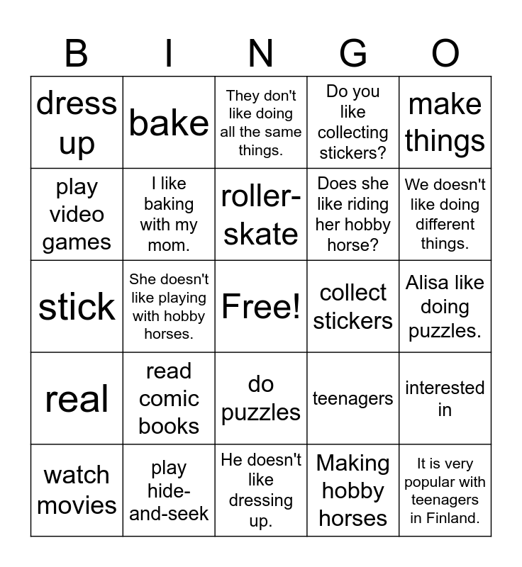 This bingo card has a free space and 24 words: read comic books, play hide-and-seek, roller-skate, watch movies, make things, dress up, play video games, bake, collect stickers, do puzzles, Does she like riding her hobby horse?, stick, teenagers, interested in, I like baking with my mom., Making hobby horses, Alisa like doing puzzles., They don't like doing all the same things., We doesn't like doing different things., She doesn't like playing with hobby horses., It is very popular with teenagers in Finland., real, Do you like collecting stickers? and He doesn't like dressing up..