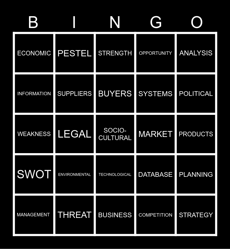 This bingo card has 27 words: DATABASE, STRATEGY, SYSTEMS, BUSINESS, INFORMATION, STRENGTH, PESTEL, SWOT, MARKET, PLANNING, WEAKNESS, OPPORTUNITY, MANAGEMENT, THREAT, POLITICAL, SERVICES, SUPPLIERS, BUYERS, ENVIRONMENTAL, ECONOMIC, PRODUCTS, COMPETITION, LEGAL, SOCIO-CULTURAL, TECHNOLOGICAL, ANALYSIS and PROFIT.