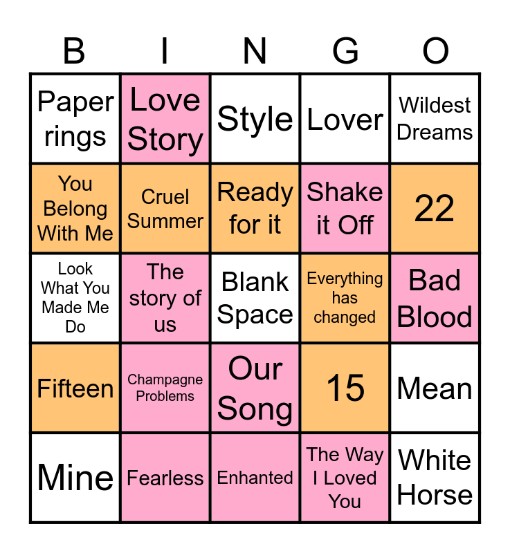 This bingo card has a free space and 24 words: Champagne Problems, Fearless, Ready for it, Mine, Wildest Dreams, Paper rings, You Belong With Me, Love Story, Everything has changed, Our Song, Shake it Off, Look What You Made Me Do, 15, Mean, Cruel Summer, The Way I Loved You, Bad Blood, Style, 22, The story of us, White Horse, Fifteen, Lover and Enhanted.