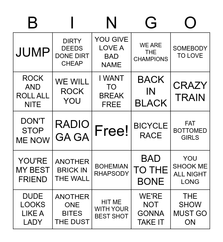 This bingo card has a free space and 40 words: CRAZY LITTLE THING CALLED LOVE, DON'T STOP ME NOW, UNDER PRESSURE, WE WILL ROCK YOU, ANOTHER ONE BITES THE DUST, BOHEMIAN RHAPSODY, I WANT TO BREAK FREE, KILLER QUEEN, SOMEBODY TO LOVE, YOU'RE MY BEST FRIEND, RADIO GA GA, WE ARE THE CHAMPIONS, THE SHOW MUST GO ON, FAT BOTTOMED GIRLS, BICYCLE RACE, ANOTHER BRICK IN THE WALL, SWEET CHILD O MINE, JUMP, HIGHWAY TO HELL, YOU GIVE LOVE A BAD NAME, YOU SHOOK ME ALL NIGHT LONG, WE'RE NOT GONNA TAKE IT, BACK IN BLACK, ROCK AND ROLL ALL NITE, DON'T STOP BELIEVIN, THUNDERDTRUCK, WELCOME TO THE JUNGLE, I WAS MADE FOR LOVING YOU, THE FINAL COUNTDOWN, ROCK YOU LIKE A HURRICANE, ANY WAY YOU WANT IT, DUDE LOOKS LIKE A LADY, BAD MEDECINE, BAD TO THE BONE, CRAZY TRAIN, HIT ME WITH YOUR BEST SHOT, I WANNA ROCK, POUR SOME SUGAR ON ME, DIRTY DEEDS DONE DIRT CHEAP and CHERRY PIE.